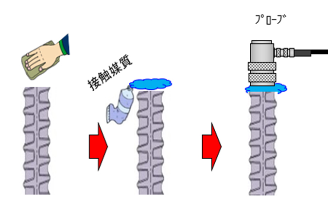 超音波が測定対象物に入射しやすよう、対象物のプローブ接触面を整え、接触媒質を塗布します。