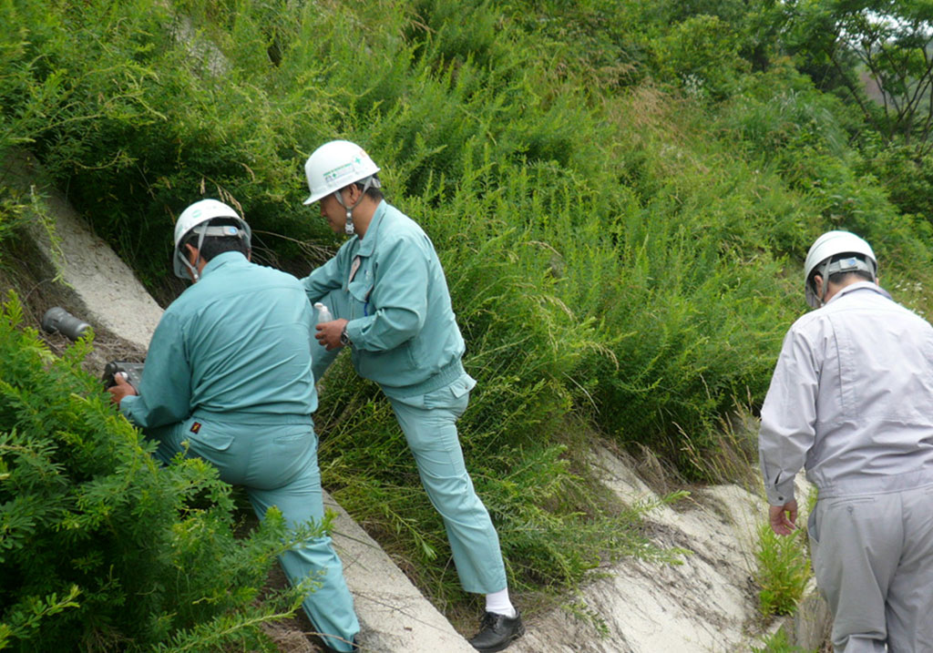 高所や切土法面などロープアクセスによる作業となる場合、プローブの取扱いは法面工などの専門作業員が作業します。